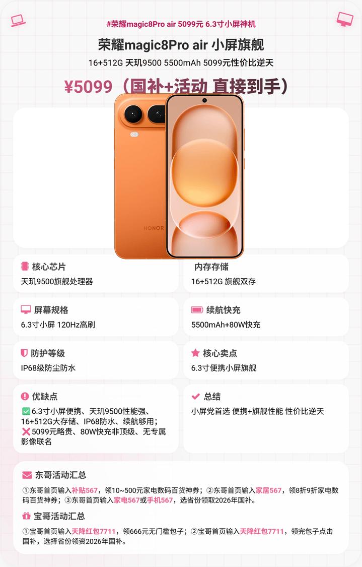 2. 荣耀Magic8 Pro air(国补+活动到手价5099元)——推荐星级:★★★★☆(4星半)